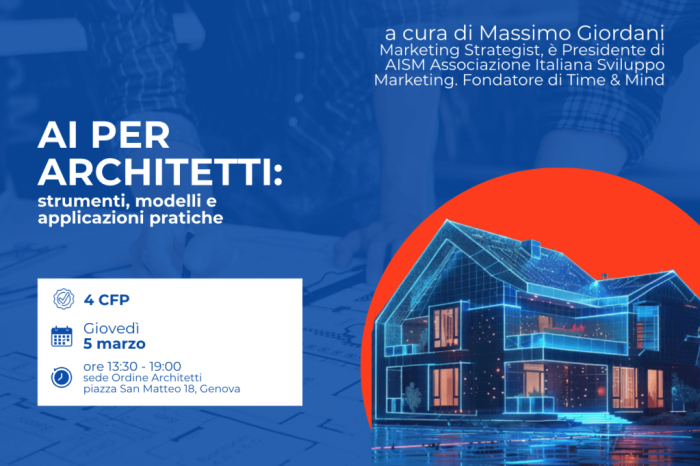 Giovedì 5 marzo, presso la Sede ordine Architetti Genova (Piazza San Matteo 18) dalle 13:30 alle 19:00, si terrà l’evento AI per architetti: strumenti, modelli e applicazioni pratiche (4 CFP) a cura di Massimo Giordani e promosso da Fidra.