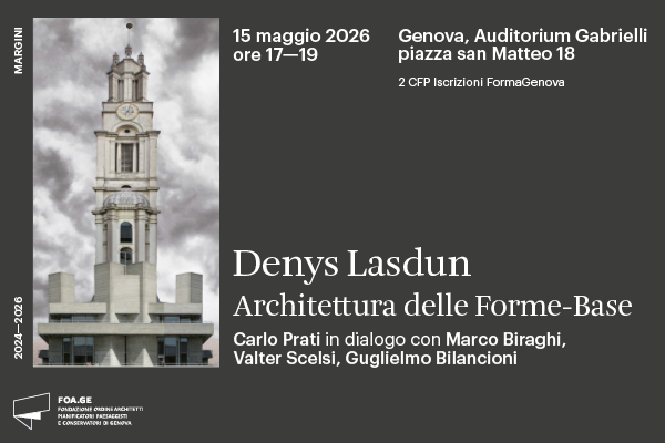 Venerdì 15 maggio 2026 dalle 17.00 alle19.00 l’Auditorium Gabrielli in piazza San Matteo 18,la conferenza dedicata alla figura dell’architetto britannico Denys Lasdun. Per l’occasione, Carlo Prati, autore della recente pubblicazione Denys Lasdun. Architettura delle Forme-Base (Edizioni Pendragon, aprile 2026), dialogherà con Marco Biraghi, Valter Scelsi e Guglielmo Bilancioni. 2 CFP con iscrizione su Formagenova.it.