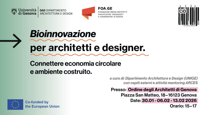 ’Ordine degli Architetti di Genova ospita, tra gennaio e febbraio 2026, il corso di formazione “Bioinnovazione per architetti e designer. Connettere economia circolare e ambiente costruito”, un percorso di 12 ore dedicato a professionisti e progettisti interessati a integrare i principi dell’economia circolare nel progetto dell’ambiente costruito, dell’architettura e del design di prodotto. Il corso esplora l’intero ciclo di vita di prodotti e servizi, dall’ideazione allo smaltimento, in linea con la definizione di economia circolare della Ellen MacArthur Foundation.