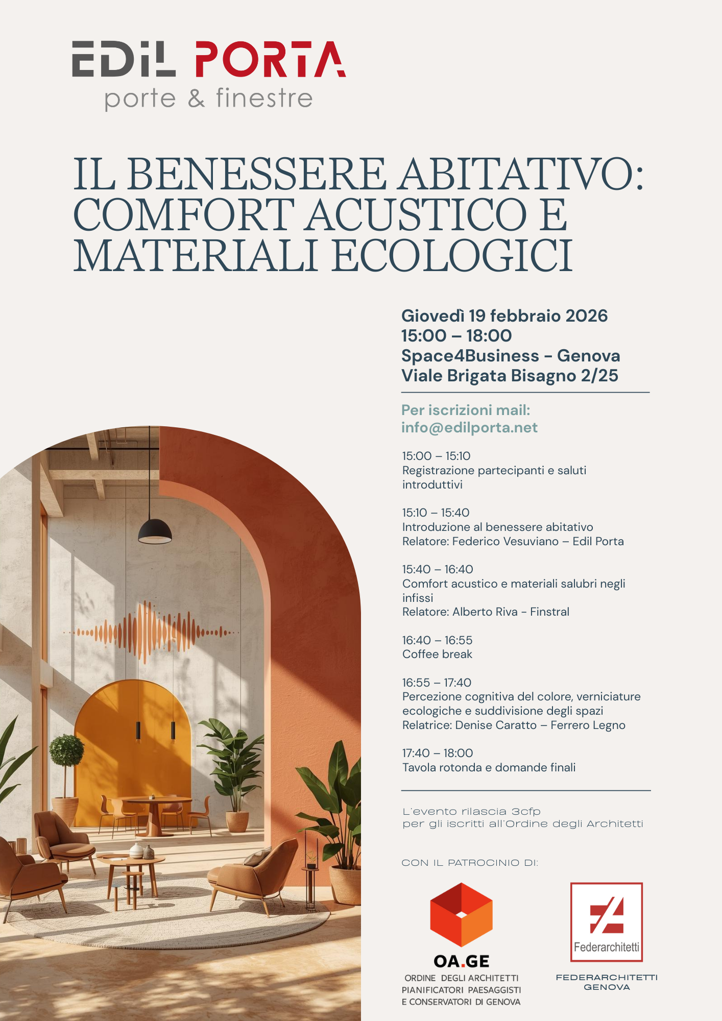 Giovedì 19 febbraio 2026, presso Space4Business (Viale Brigata Bisagno 2/25, 16129 Genova) dalle 15:00 alle 18:00 si terrà il corso patrocinato da OAGE e a cura di Edilporta Il benessere abitativo: comfort acustico e materiali ecologici (3 CFP).