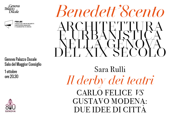 Mercoledì 1 ottobre 2025, alle ore 20:30 nella Sala del Maggior Consiglio di Palazzo Ducale Genova, si terrà l’incontro Il derby dei teatri. Carlo Felice VS Gustavo Modena: due idee di città con Sara Rulli. L’evento fa parte del ciclo di incontri Benedett’Ottocento – Architettura e Urbanistica nella Genova del XIX secolo a cura della Fondazione Ordine Architetti PPC di Genova.