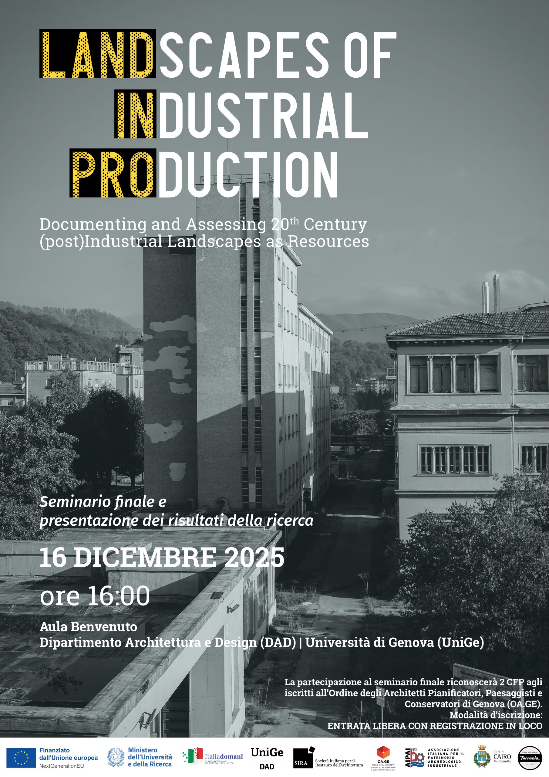 Che cosa resta, oggi, dei paesaggi della produzione industriale del Novecento? Quali sono le sfide che le politiche di tutela e gli strumenti di pianificazione affrontano nella gestione delle trasformazioni di questi paesaggi culturali? Come possono diventare una risorsa per le comunità? A queste domande prova a rispondere “Landscapes of Industrial Production: Documenting and Assessing 20th Century (post) Industrial Landscapes as Resources (Land-In-Pro)”, progetto di ricerca finanziato nell’ambito del bando PNRR-YR 2022 e svolto presso il Dipartimento Architettura e Design (DAD) dell’Università di Genova (UniGe).