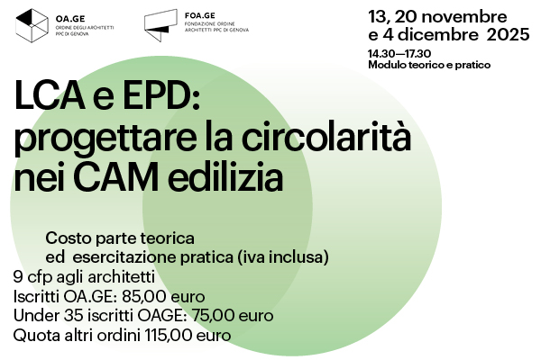 Il corso teorico e pratico si terrà il 13 e il 20 novembre 2025 in modalità webinar su Formagenova.it, dalle 14:30 alle 17:30, e il 4 dicembre in aula presso la sede dell’Ordine in piazza San Matteo 18 a Genova, sempre dalle 14:30 alle 17:30. Fornisce strumenti pratici per applicare l’analisi del ciclo di vita (LCA) in edilizia, valutare l’impatto ambientale di prodotti ed edifici e utilizzare in modo efficace le EPD. Un’opportunità per acquisire competenze utili a garantire sostenibilità e conformità ai CAM Edilizia (D.M. 23/06/2022).