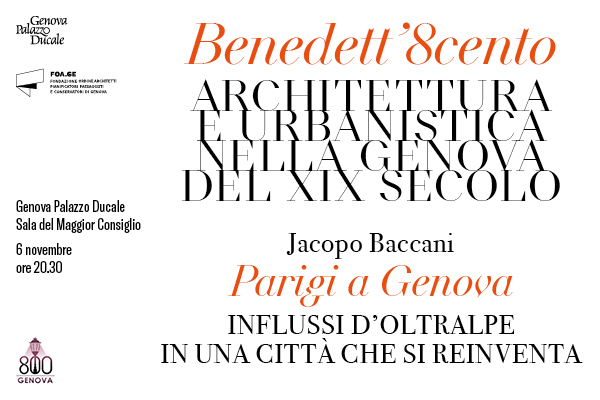 Giovedì 6 novembre 2025, alle ore 20:30 nella Sala del Maggior Consiglio di Palazzo Ducale Genova, si terrà l’incontro Parigi a Genova. Influssi d’Oltralpe in una città che si reinventa con Jacopo Baccani. L’evento fa parte del ciclo di incontri Benedett’Ottocento – Architettura e Urbanistica nella Genova del XIX secolo a cura della Fondazione Ordine Architetti PPC di Genova.