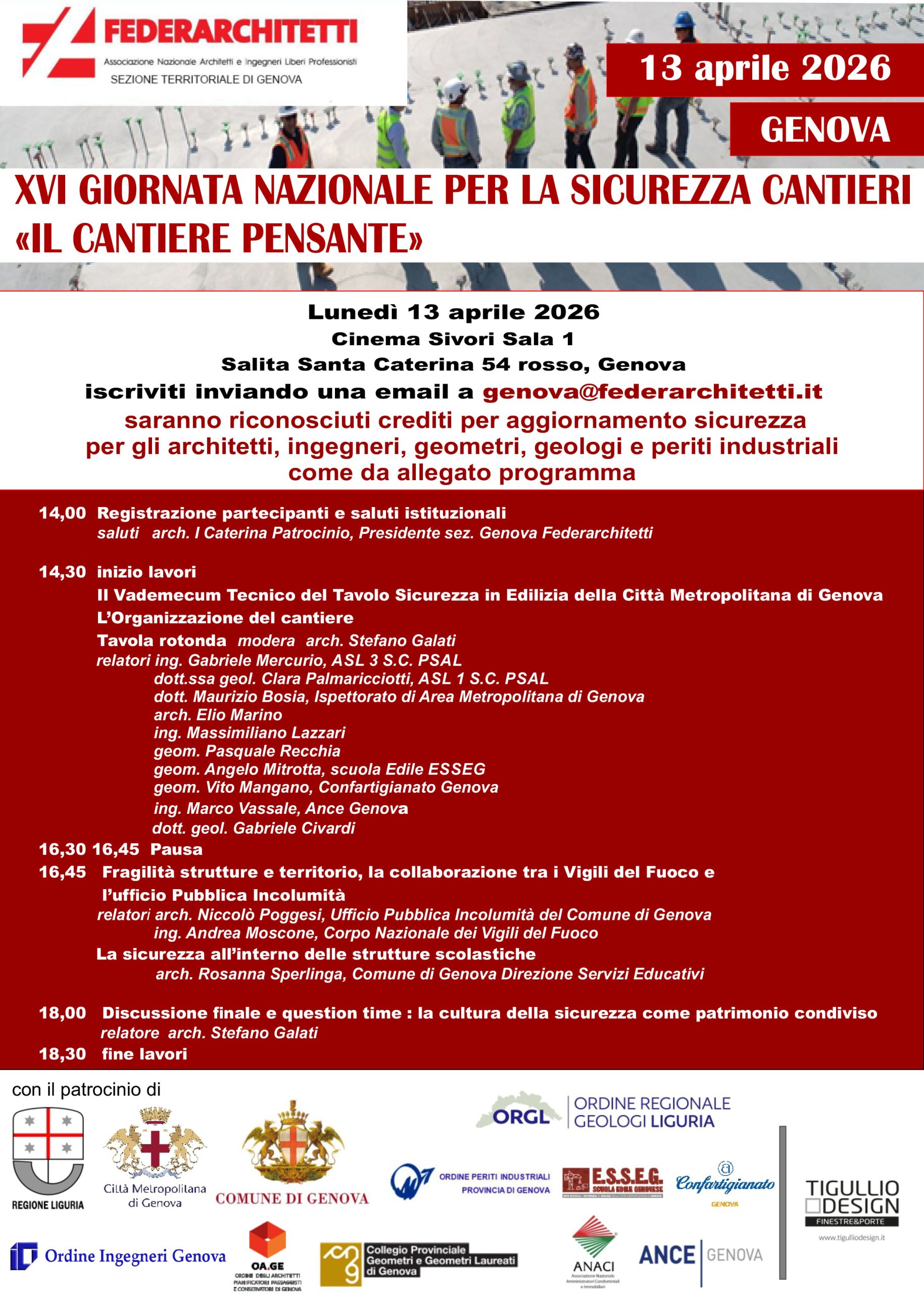 Lunedì 13 aprile 2026, presso il Cinema Sivori Sala 1 – Salita Santa Caterina 54 rosso, Genova, si terrà l’evento XVI Giornata Nazionale Sicurezza Cantieri “Il cantiere pensante” (4 CFP) a cura di Federarchitetti e patrocinato dall’Ordine degli Architetti Pianificatori Paesaggisti e Conservatori di Genova.