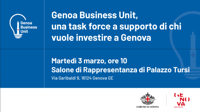 Martedì 3 marzo, alle ore 10, nel Salone di Rappresentanza di Palazzo Tursi verrà presentata l’attività della Genova Business Unit, struttura operativa del Comune di Genova dedicata a imprese e investitori per rendere più agevole ed efficace l’incontro tra chi intende avviare un’attività e il sistema di opportunità che il territorio è in grado di esprimere.