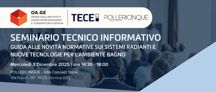L’evento prevede la partecipazione ad un seminario con il contributo dell’azienda TECE Italia, finalizzato a presentare gli aspetti tecnici e pratici dei vari sistemi radianti a bassa differenza di temperatura, come prevenire la legionella negli impianti idrico-sanitari.