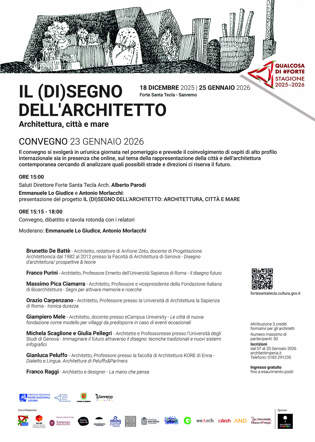 Dal 18 dicembre 2025 al 25 gennaio 2026, il Forte Santa Tecla a Sanremo (IM), ospita la mostra: “IL (DI)SEGNO DELL’ARCHITETTO, architettura, città e mare”. La mostra, ideata e curata da Emmanuele Lo Giudice in collaborazione con Roberto De Luca e Floriana Orlandino, pone al centro il tema del disegno in architettura. La mostra e il convegno fanno parte degli eventi per la stagione 2025/2026 di Forte Santa Tecla Sanremo, luogo della cultura afferente alla Direzione regionale Musei Nazionali Liguria del Ministero della Cultura.