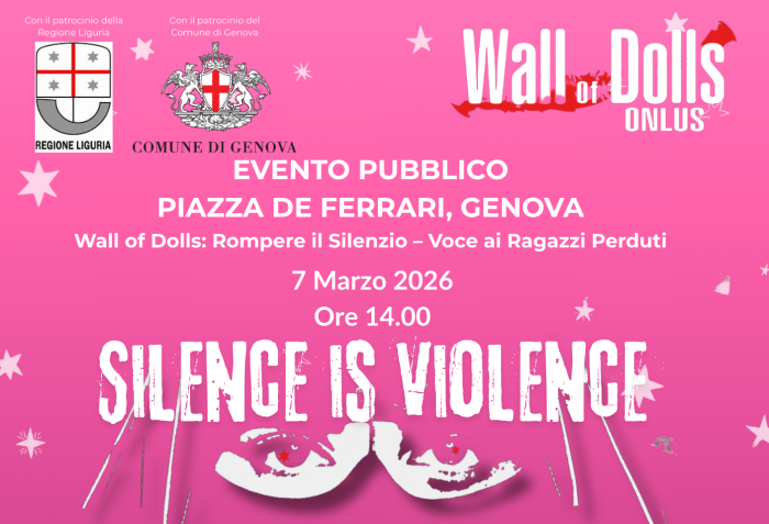 In occasione della giornata internazionale della Donna, il 7 marzo 2026, dalle ore 14, in Piazza De Ferrari, si svolgerà l’evento “Silence is violence” a cura dell’associazione Wall of Dolls, quest’anno dedicato ai ragazzi di Crans Montana. Parteciperanno Jo Squillo, Fondatrice dell’Associazione, Francesca Carollo, Presidentessa dell’Associazione. Con loro sul palco la giornalista Jessica Nicolini e Liliana Ruocco, che si alterneranno nel presentare il programma, e Alexandra Salina, ambassador dell’associazione e content creator. Previsto anche un DJ Set con Massimo Gallesio e Boss Lady Vy. La manifestazione è patrocinata da Regione Liguria, Comune di Genova e anche dall’Ordine.